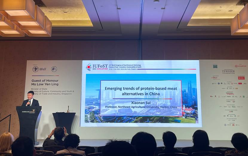 会议期间,国际食品科学技术联盟宣布,经中国食品科学技术学会提名推荐,世界各国联盟成员专家评审,williamhill官网隋晓楠教授荣获2022-2023年度国际食品科学技术联盟“青年科学家奖”(IUFoST Young Scientist Award),以表彰其在大豆蛋白质结构的基础研究和功能特性的应用开发研究方面取得的卓越成果。此次获奖充分体现了国际食品科技界对我国青年科学家的优秀素质与杰出成就的肯定与赞誉。隋晓楠教授作为本届会议来自中国高校的唯一获奖者,受邀作大会主题报告(Plenary Talk),与全球食品领域学者分享我国植物基肉制品的研发现状发展趋势。