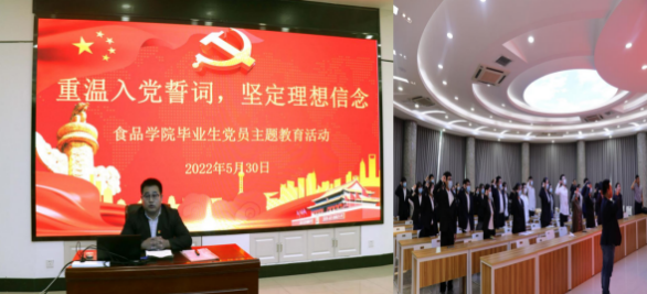 随后,全体人员回到食品实验楼315会议室。学院副处级辅导员刘双奇以优秀党员身份同毕业生党员进行交流,刘双奇在谈话中指出,作为青年党员,要始终保持思想上的绝对纯洁、信念上的绝对坚定、政治上的绝对清醒,不断增强党性意识、忠诚意识;矢志追求更有高度、更有境界、更有品位的人生;不在“内卷”“躺平”“焦虑”的裹挟中生存;心向下沉、脚向下走、力向下使,在基层实践中磨炼意志、提高能力、积累经验,增长才干,用实实在在的业绩赢得群众的信任、组织的认可,实现自我价值。紧接着,全体党员一同重温了入党誓词。