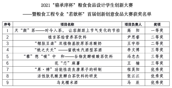 感谢骆先生弟子的资助,让学生们的创新研究得以骆老精神之光的泽被。“若歆”为粮食专业学生创新成果,并已完成商标注册,为鼓励学生的创新精神,并启发更多的创新出现,特以此做为首届粮食工程专业竞赛的冠名。